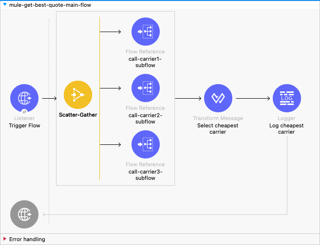 Here’s an example of Mule’s Scatter-Gather in action. The Mule event is sent to three routes in parallel. Each route below invokes a subflow that handles the request for a relevant carrier.