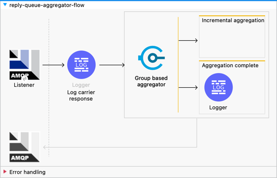 The Mule application receives all the bids through the messaging reply channel. Each response is processed by a group-based aggregator, which organises the responses by their correlation IDs. The aggregation continues until all responses in a group are collected, either reaching the desired group size or when a timeout occurs.